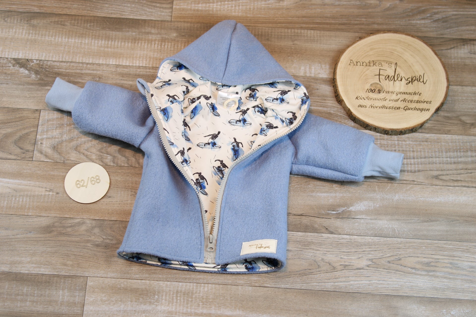 Wollwalkjacke Hellblau mit Surfern